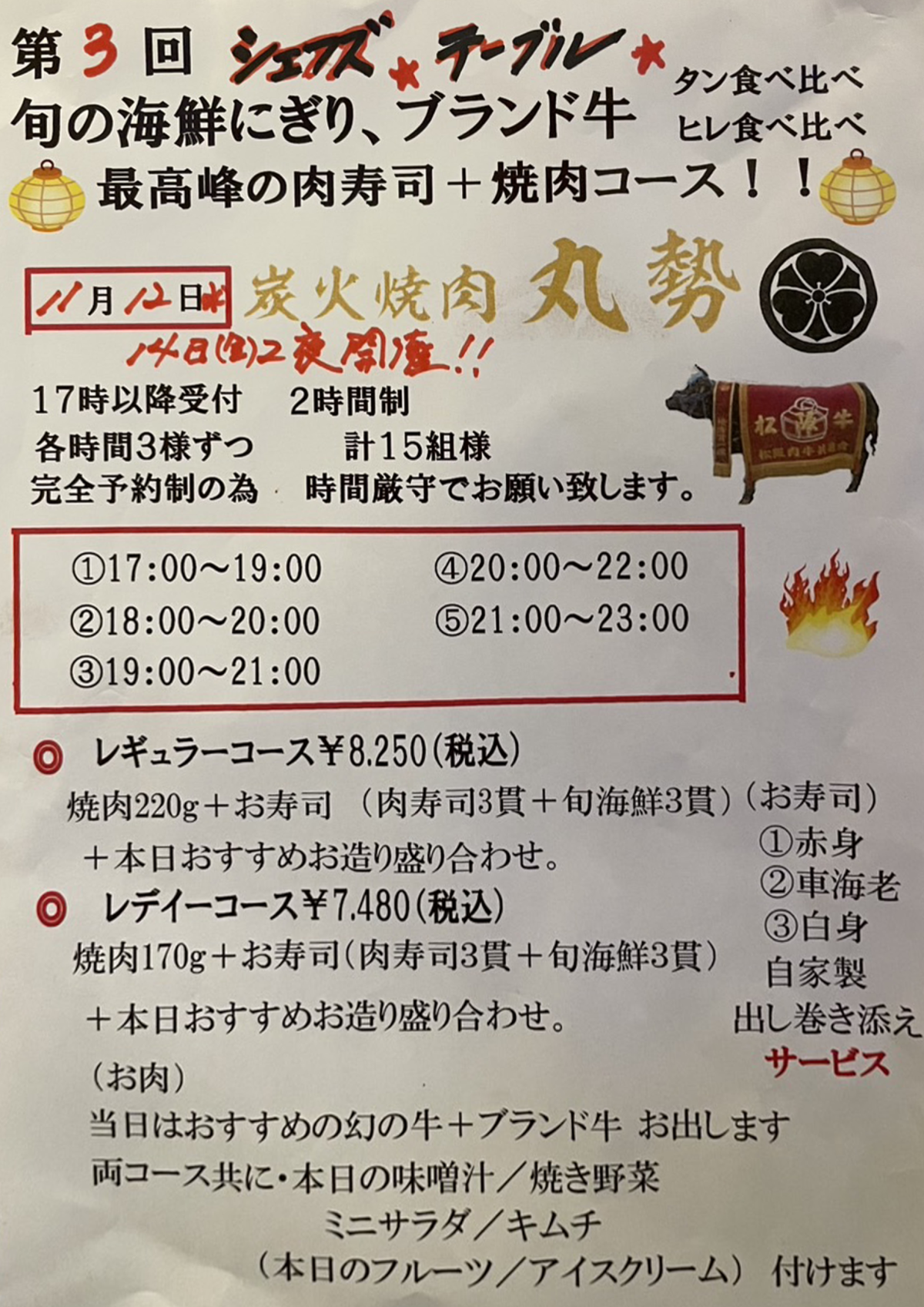 2025年11月キャンペーン情報を更新しました、 2025年9月30日2025年9月30日 ☆ご予約承っております☆11月のシェフズテーブルは、2夜(11/12、11/14)開催致します。お席確保のため、キャンセル不可とさせていただいております。予めご了承下さい。