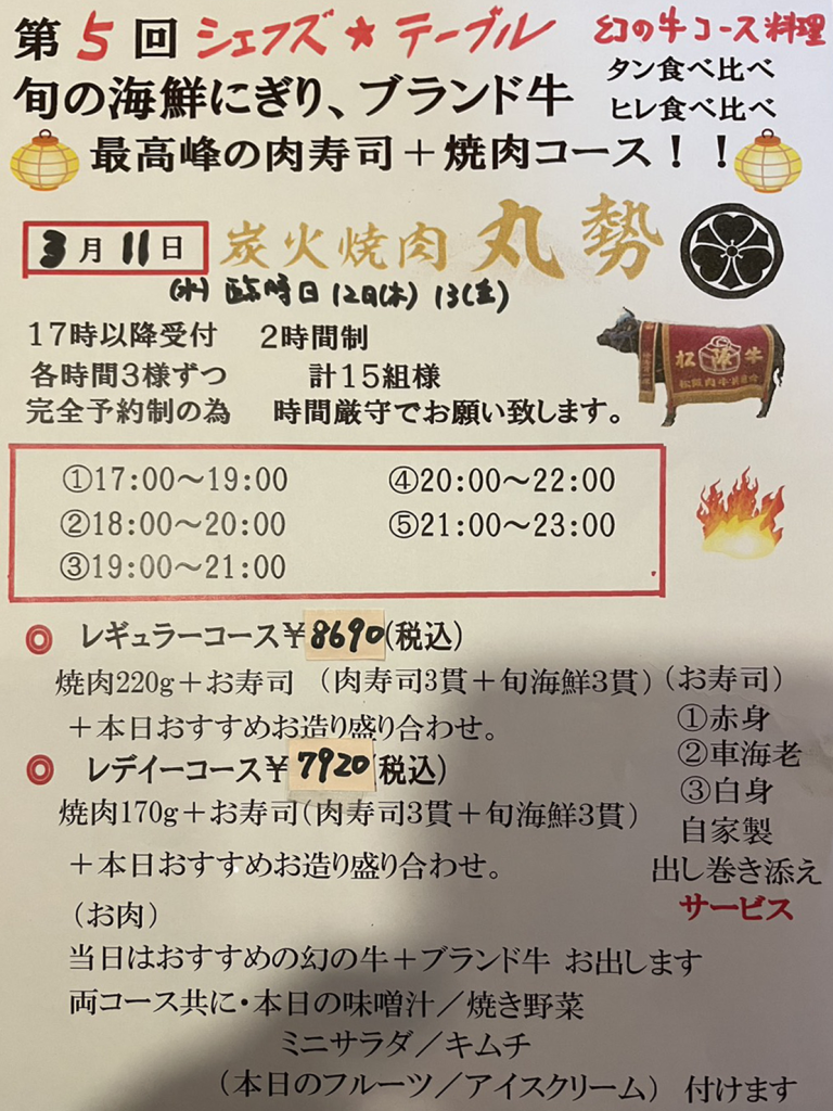 • 第5回 シェフズ☆テーブル 最高峰の肉寿司+焼肉コース!(3/11)